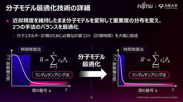 分子のエネルギー計算では、分子モデルを多数の項に分割し、「時間発展法」と「ランダムサンプリング法」という2つの手法を、各項の重要度に応じて使い分けることで計算コストを下げてきた。今回開発した技術は、近似精度を維持したまま分子モデルを変形して重要度の分布を変え、2つの手法のバランスを最適化する。これにより、エネルギー計算のための量子回路に含まれるゲート数を最小化し、計算時間を既存手法よりも削減する。