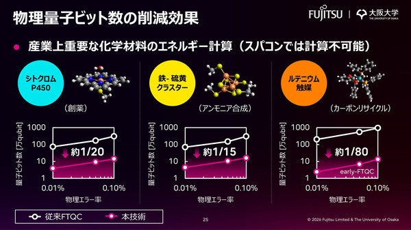 富士通と大阪大学は、量子コンピュータを化学材料のエネルギー計算に使えるようにする2つの技術を開発した。(1)FTQC(誤り訂正量子コンピュータ)向け新ソフトウェアアーキテクチャ「STARアーキテクチャ Ver.3」と、(2)「分子モデル最適化技術」である。この2つを組み合わせることで計算リソースを削減し、現実的な時間で計算できる見込みを得たとしている。