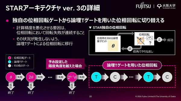 図3:STARアーキテクチャ ver.3の詳細。位相回転ゲートと論理Tゲートを組み合わせて計算精度を高める(出典:富士通、大阪大学)拡大画像表示