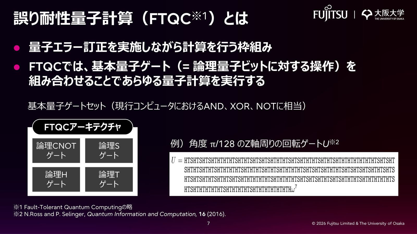 図1:FTQC(誤り訂正量子コンピュータ)アーキテクチャにおける基本ゲートセット(出典:富士通、大阪大学)拡大画像表示