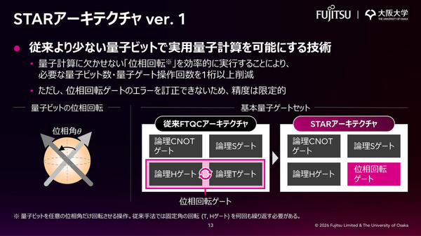 図2:STARアーキテクチャの詳細。FTQCで多用する論理Tゲートを位相回転ゲートに置き換えることで、計算に必要な量子ビット数を削減する(出典:富士通、大阪大学)拡大画像表示