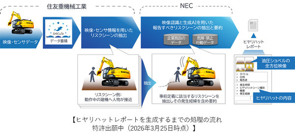 住友重機械工業は、油圧ショベルに搭載したカメラの映像やセンサー情報からヒヤリハットを抽出して報告レポートを自動生成するシステムを、NECと共同で開発する。2026年4月に開発を始め、2027年度の実用化を目指す(図1)。
