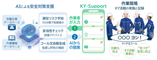 しかし、若年層や経験の浅い作業者は潜在的なリスクに気づきにくい。一方、ベテラン層はKY活動が形骸化しやすい。こうした課題を解消し、誰もが質の高いKY活動を実施できる仕組みを構築するため、AIを活用したKY活動支援アプリケーションを開発した(図1)。