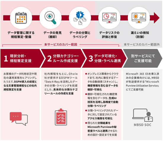 三井物産セキュアディレクション(MBSD)は2026年3月26日、「データセキュリティ(DSPM)導入支援サービス」を同年4月1日から提供すると発表した。生成AIを活用したマクニカのデータ分類ツール「Data X-Ray」(開発元:英Ohalo)を活用して、企業内に散在するデータを棚卸しして分類する。現状分析・文書管理規程の策定から、分類カテゴリー・ルールの作成、機密データの棚卸し・可視化・自動分類の実装まで、DSPM(データセキュリティ動態管理)への取り組みをワンストップで支援する。