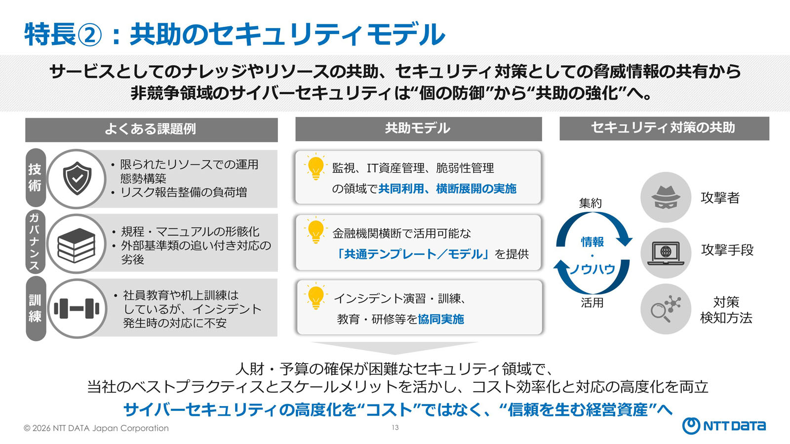図4:「金融総合セキュリティサービス」で採用する互助型セキュリティモデルの概要(出典:NTTデータ)拡大画像表示
