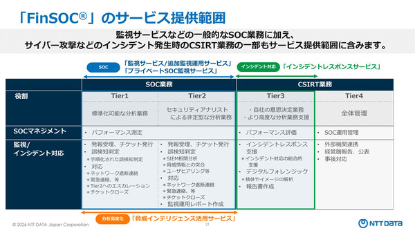 図2:金融機関向け共同利用型SOC「FinSOC」のサービス提供範囲(出典:NTTデータ)拡大画像表示