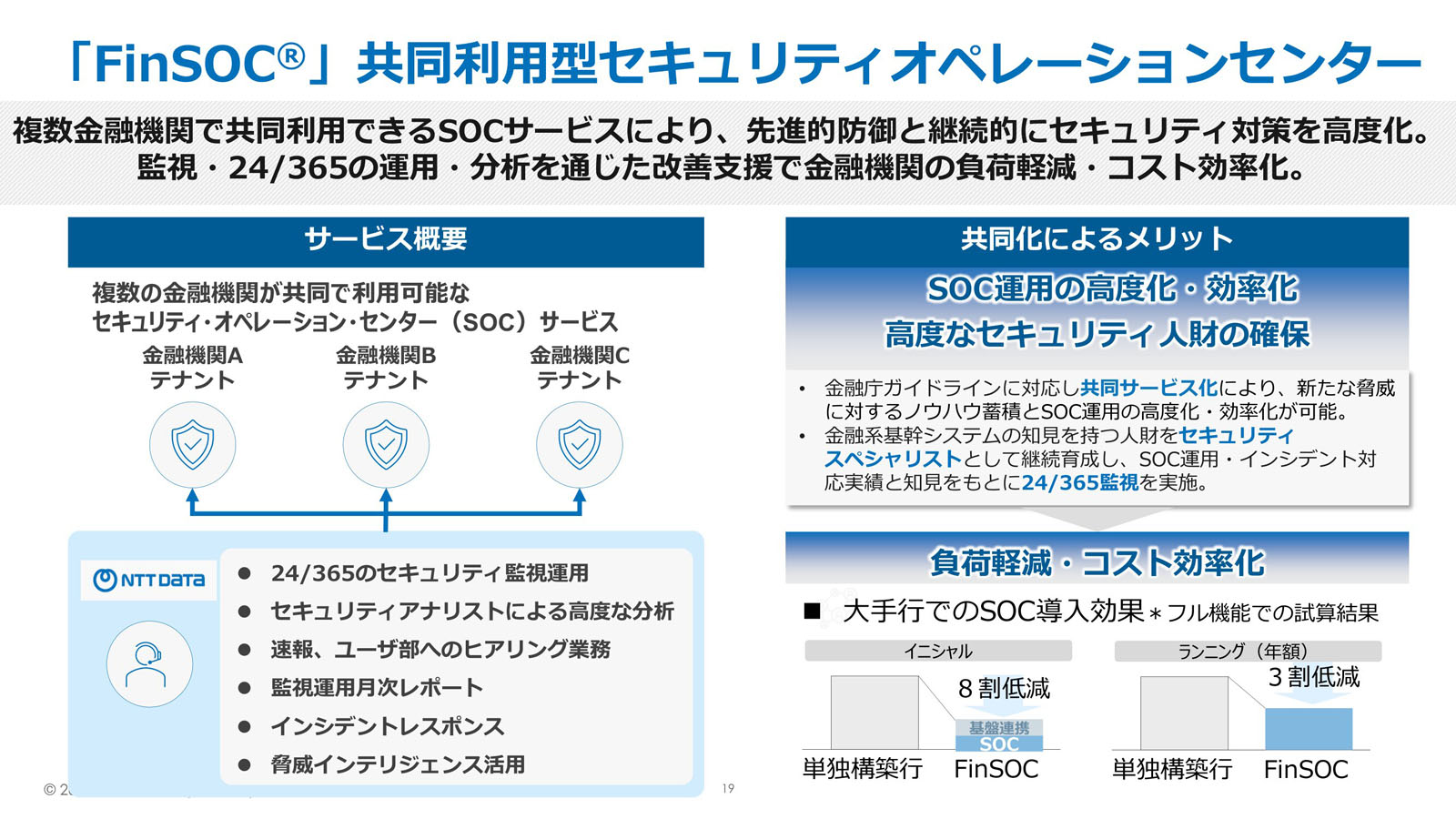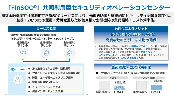 NTTデータは2026年3月27日、金融機関向け共同利用型SOC(セキュリティ・オペレーション・センター)サービス「FinSOC(フィンソック)」を提供開始した。システム基盤と運用リソースを複数の金融機関で共有することで、金融機関ごとにSOCを構築した場合と比べて安価に運営できる。導入効果の試算では、導入コストが8割、運用コストが3割減るという。記事執筆時点で5行が採用済みまたは導入予定であり、今後3年で20~30行の採用を目標としている。