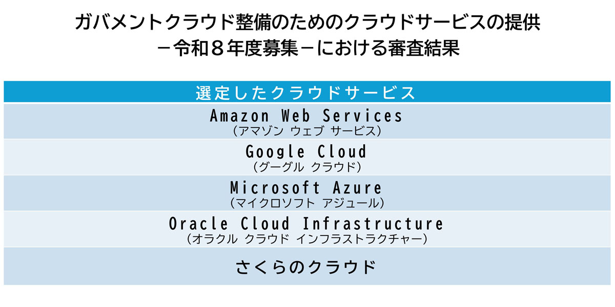 デジタル庁は同日、2026年度の「ガバメントクラウド整備のためのクラウドサービス」の対象サービス5つも公表し、さくらのクラウドを選定した(図1)。その他の4サービスは「Amazon Web Services(AWS)」「Google Cloud」「Microsoft Azure」「Oracle Cloud Infrastructure(OCI)」である。