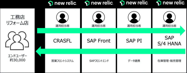 トイレや窓などの住宅設備・建材を手がけるLIXILは、3万超のユーザーが利用する工務店・リフォーム店向け営業フロントシステム「CRASFL」に、システム性能監視ソフトウェア「New Relic」を導入した。複数システムが多段で連携する環境全体の性能を可視化し、問題の原因特定に要する時間を1年間で約200時間削減した。New Relicが2026年3月27日に発表した。