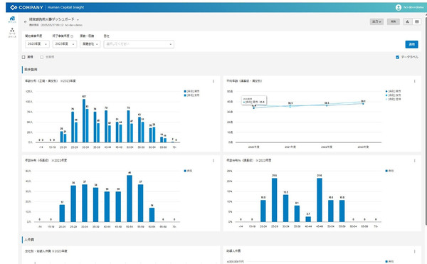 COMPANYのタレントマネジメント機能は、人事・給与・勤怠・評価などを同一データベースで管理するため、データの加工や連携作業が不要になり、人的資本データをリアルタイムに可視化・分析できるようになる。
