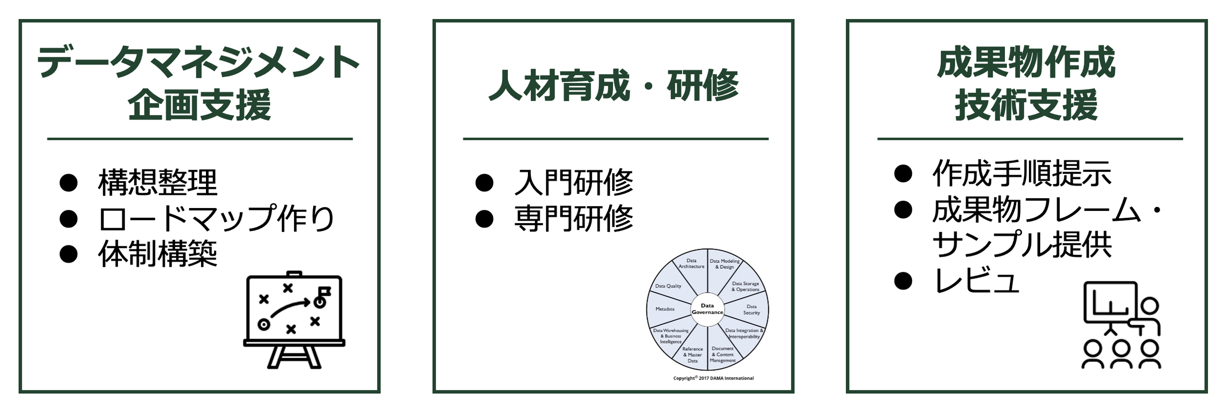 Metafindコンサルティングは、データマネジメント企画支援や人材育成・研修、成果物作成・技術支援を柱とするソリューションを提供。ソニーセミコンダクタソリューションズと同様にデータマネジメントの内製化を目指す企業の構想から実践、定着化まで伴走支援する体制を整えている(図3)。