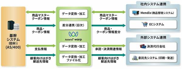 今回、商品管理システムのフロントエンドをローコード開発ツール「Mendix」で刷新したことを機に、データ連携基盤としてASTERIA Warp(以下、Warp)を導入した(図1)。Warpの選定にあたっては、ノーコードで設定できることや、連携処理全体を俯瞰できることなどを評価した。