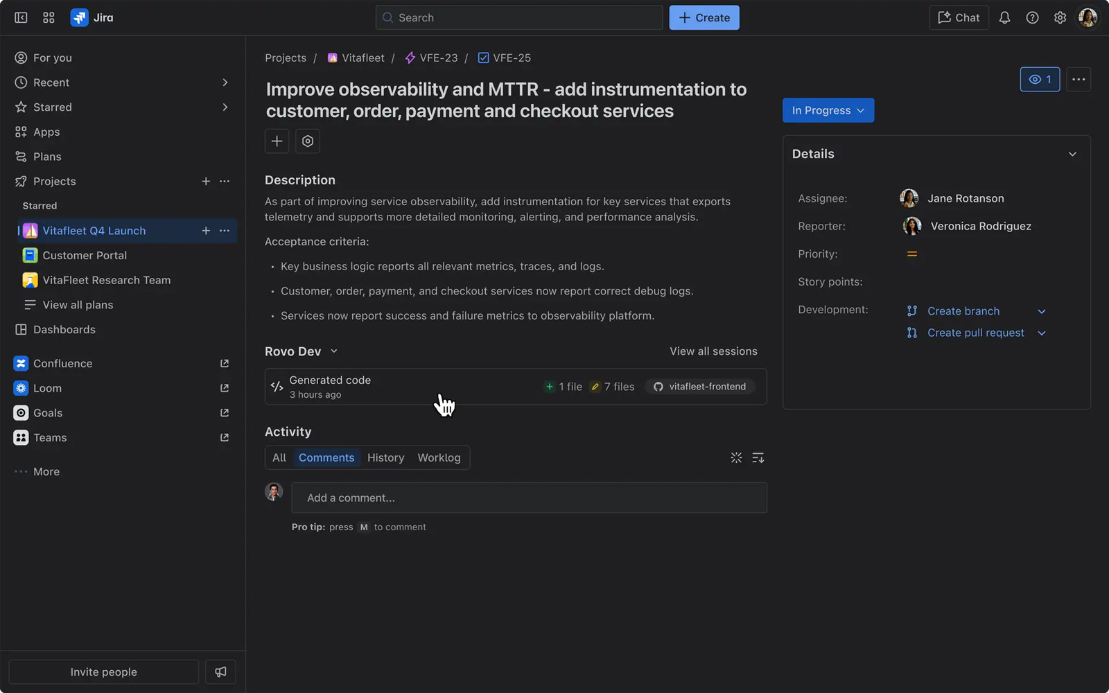 生成したプルリクエストは、Jiraのワークアイテムに自動でひも付けられる。これにより、プロダクトマネージャーやデザイナーといった非エンジニアも、普段使っているJiraの画面から、Rovo Devの作業内容と進捗を把握可能である。