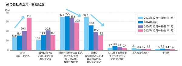 AIの活用状況も聞いた。「既に活用している」(34.1%)と「活用に向けたプロジェクトが進んでいる」(16.1%)を合わせると50.2%になり、同調査で初めて5割を突破した(図3)。AIが試行段階から本格的な活用段階へと移行しつつある。