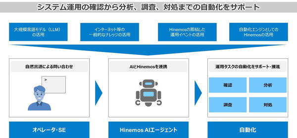 NTTデータ先端技術は2026年4月8日、システム運用管理ソフトウェア新版「Hinemos(ヒネモス) ver.7.2」を発表した。同年4月22日から提供する。新版では、MCPを介して生成AIとHinemosを接続できるようにした。生成AIに自然言語で問い合わせるだけで、監視結果などHinemos内のデータを活用した回答が得られる。販売目標は、2026年度末までに2500件。