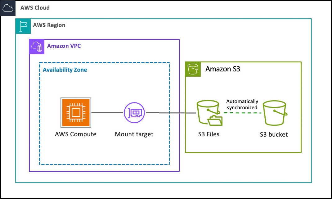 Amazon S3 Filesが自動的に、高性能ストレージに残すデータとAmazon S3から直接読み込むデータを管理する。ファイルサイズが閾値(標準で128KB)に満たないデータは、高性能ストレージのキャッシュではなくAmazon S3から直接読み込む。一定期間(標準で30日間)アクセスされなかったデータは高性能ストレージ上から自動的に削除する。データを書き込む場合、書き込みデータを高性能ストレージに書き込み、その後にAmazon S3に同期する。