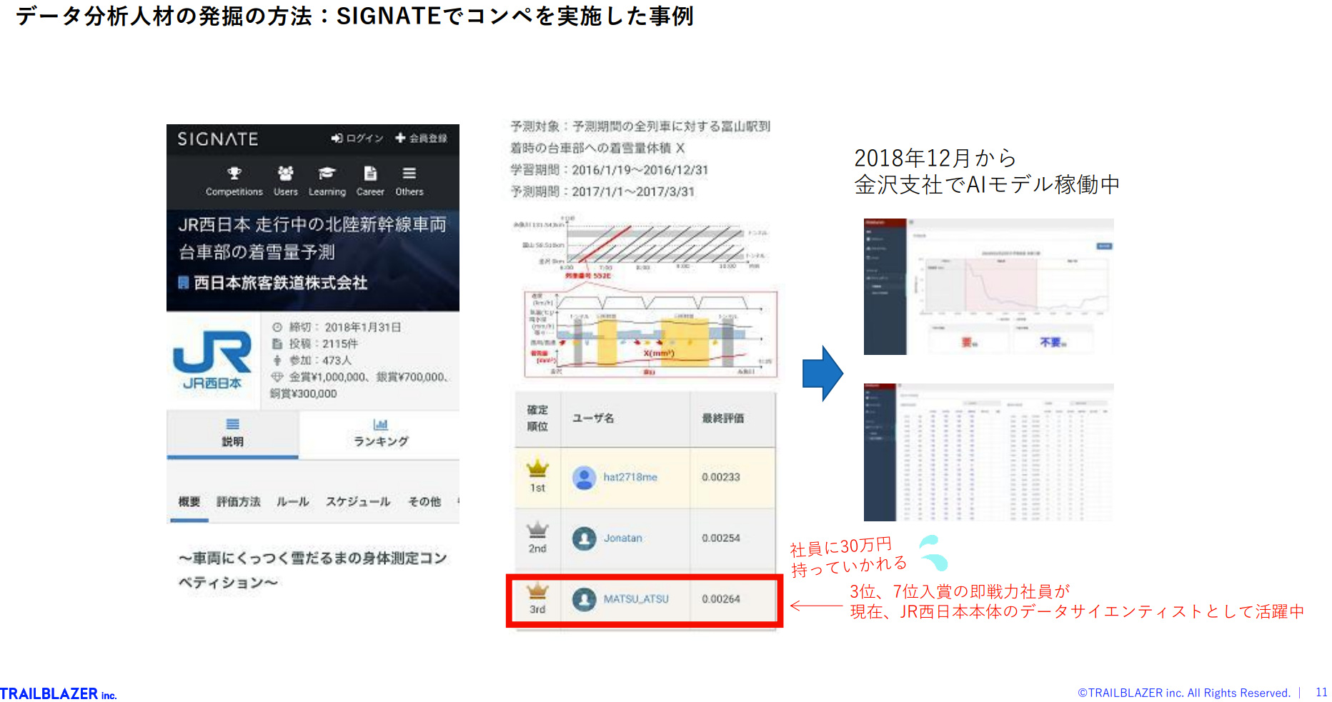 人材確保のために行った施策の一例が、データサイエンス・コンペティションの開催である。外部ベンダーや社員に参加を呼びかけ、賞金総額200万円を用意して「北陸新幹線の車両の着雪量予測」という課題解決を競わせた結果、優秀な成績を収めたのは独学で学んでいた自社の「野生のデータサイエンティスト」だった(図2)。 「社内に才能がある人材は隠れています。くすぶっている“野生児”がいると気付き、まずはデータサイエンティストの才能がある社員を探していきました」(宮崎氏)