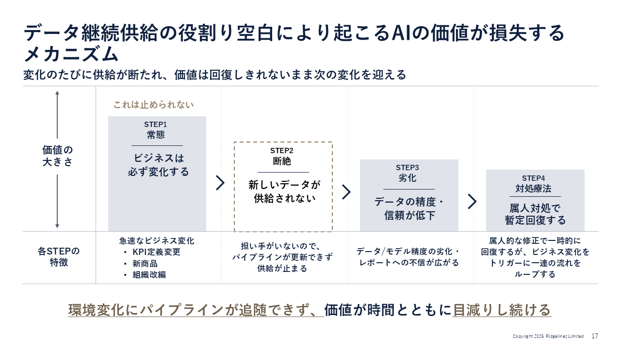 「例えば、新商品の追加や商品カテゴリの再編といった変化が起こるたびに、AIへのデータ供給パイプラインが追随できなくなります。業務システム側は改修されても、AIは古い定義のままのデータを参照し続けてしまうのです。さらに、新規事業のコード体系と不整合が生じる、組織再編に伴いデータのオーナーシップが変わり、アクセス権の再設定が滞るといった理由から、AIの推論精度が急低下していきます(図3)」(岡本氏)