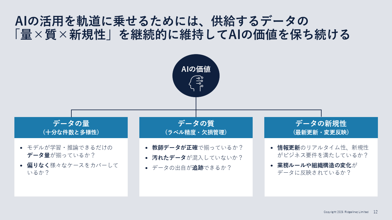 図2:AIの活用を軌道に乗せるためには、供給するデータの「量×質×新規性」を継続的に維持してAIの価値を保ち続ける拡大画像表示