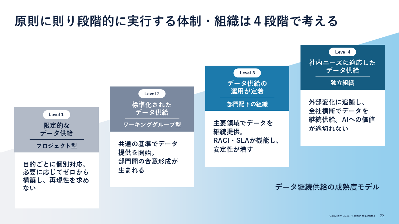 ただし、原則を定めるだけでは不十分だ。それを「誰がやるか」を設計する必要があるとして、岡本氏は次の4段階からなる「データ継続供給の成熟度モデル」を示した(図6)。