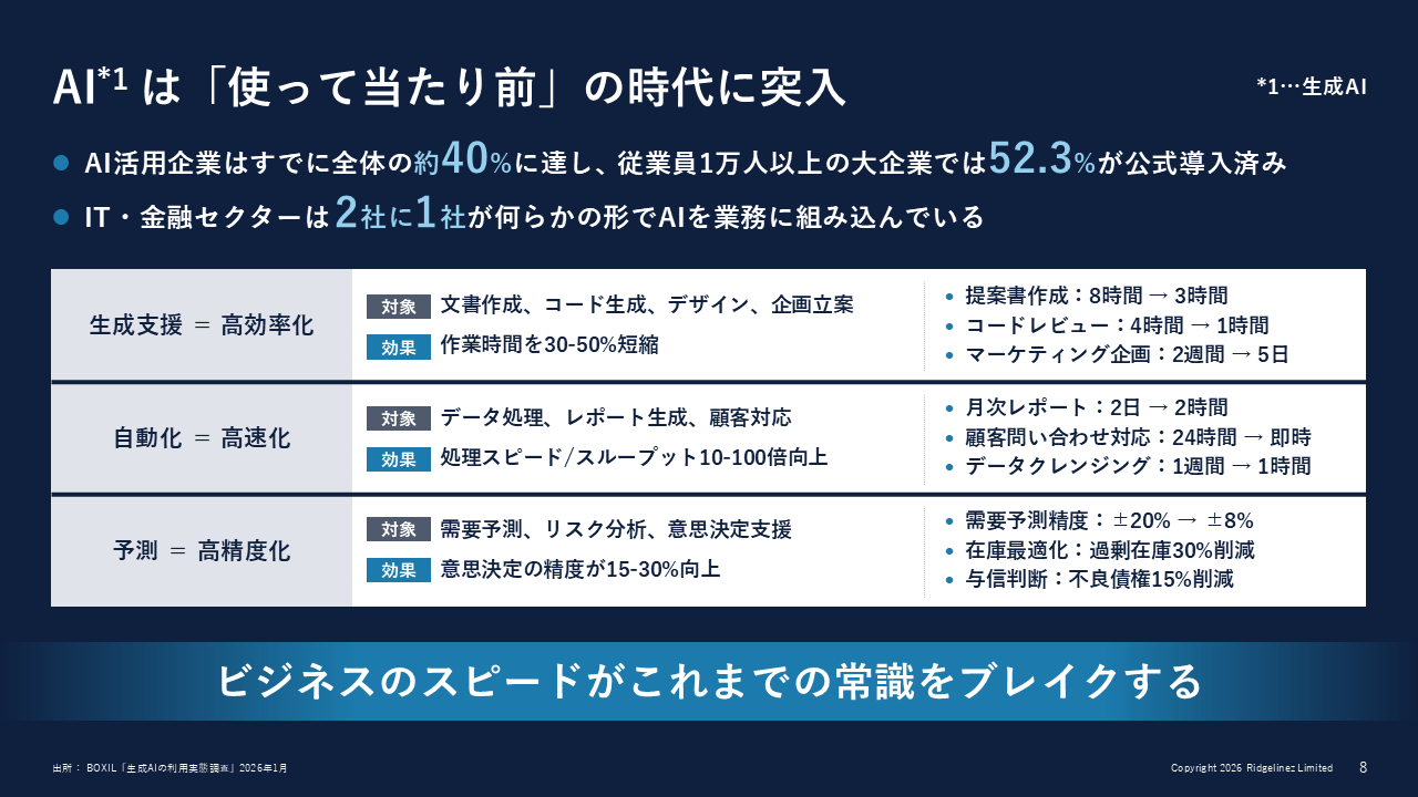 Ridgelinezの岡本裕史氏は、こうした状況を捉えつつ、「AI活用における競争の軸は『導入できたか』ではなく、『軌道に乗せられるか』にシフトしています」と説く。
