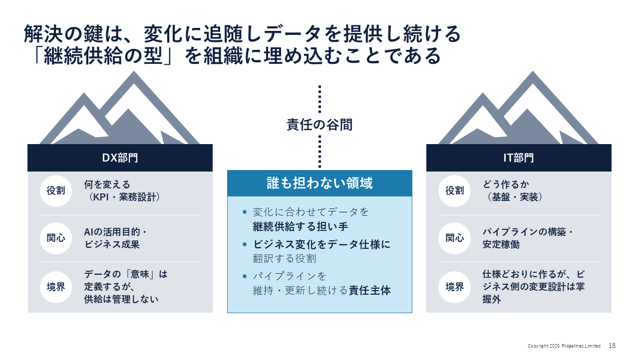 「DX推進部門はAI活用の目的やビジネス効果に強く傾倒しており、一方でIT部門はパイプラインの構築・安定稼働に意識を向けています。その間で抜け落ちているのが、ビジネスの変化をデータ仕様に翻訳する役割を担い、AIへのデータ供給パイプラインを維持・更新する責任主体です」(岡本氏)