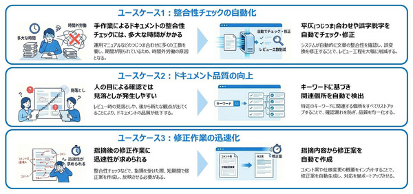 重点的に検証したユースケースは、設計書を作成してレビューする際の「整合性チェックの自動化」である。セキュリティポリシーや内部統制、業界標準などのルールから逸脱することなく自動でチェックおよび修正し、設計書レビュー工程を削減できることを確認した。今後、「ドキュメント品質の向上」と「修正作業の迅速化」のユースケースについても引き続き検証を進めていく。