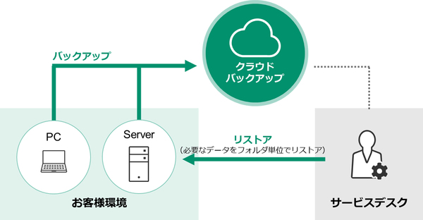 (2)クラウドバックアップサービスは、PCやサーバーに保存したデータを、クラウド上に定期的にバックアップする(図2)。これにより、ランサムウェアをはじめとするマルウェアによるデータ破壊の被害を抑制する。災害や誤操作によるデータ消失時にもデータを迅速に復旧可能である。データ復旧時には、IT Expert Servicesのサービスデスクが、必要なデータをフォルダ単位でリストアする。これにより、復旧作業にともなうユーザーの負担を軽減する。