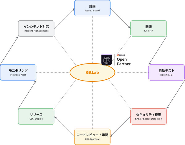 GitLabは、ソースコード管理、チケット管理、CI/CDパイプライン、セキュリティスキャンなどの機能をオールインワンで提供する。アプリケーションのメトリクスやログを監視するオブザーバビリティ(可観測性)機能も持つ。