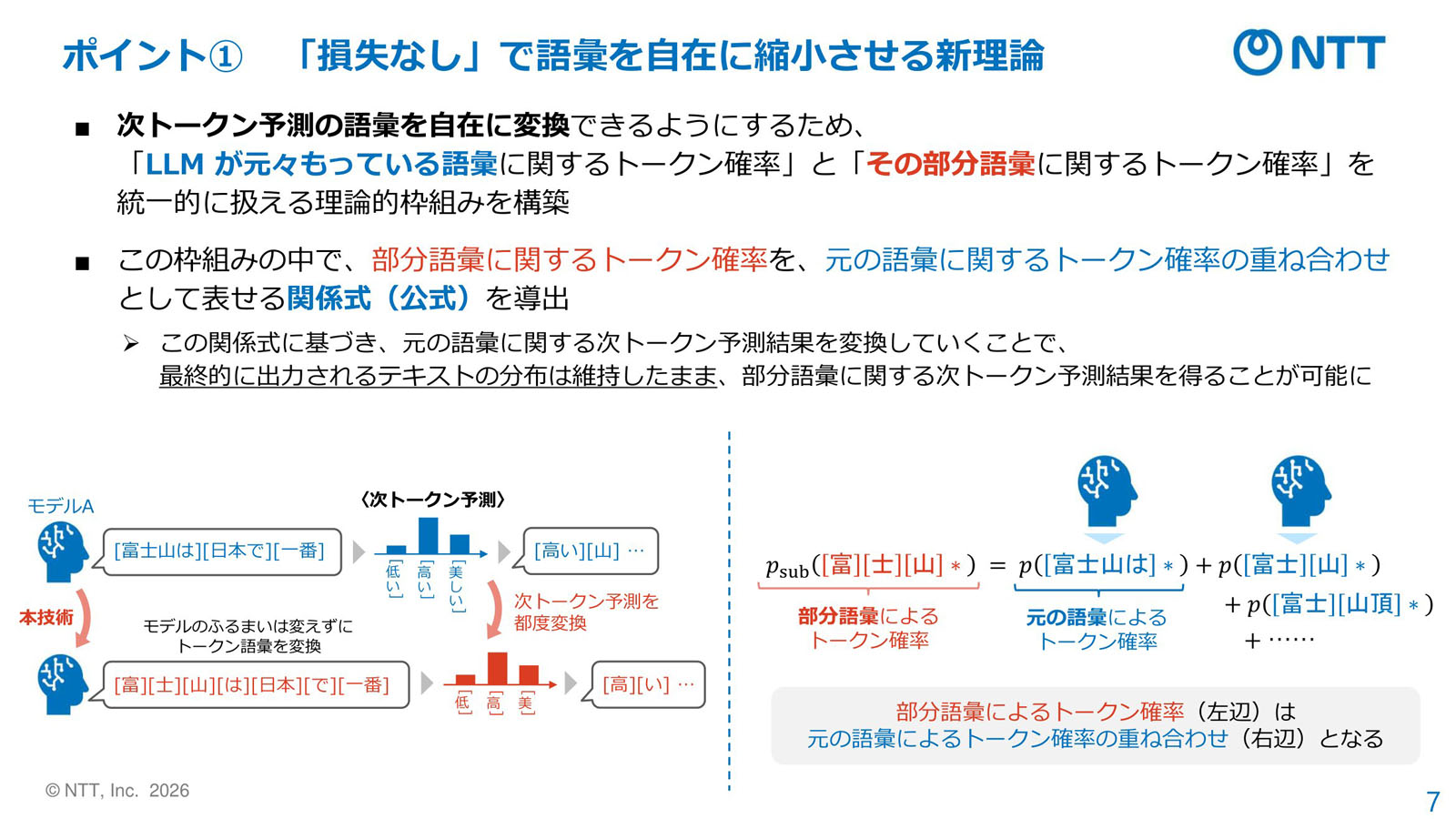 単純にトークン候補を削ると、出力品質は劣化する。例えば、「富士山」というトークンを語彙から除いた場合、そのトークンが選ばれるはずだった確率が行き場を失い、出力が変わってしまう。これに対してNTTは、除外するトークンに割り当てられていた確率を「富士」「山」など、それを構成する細かいトークンへと分配する。出力する文章全体の傾向は変わらないという。