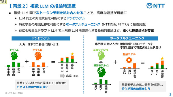 図3:複数モデルを推論時に連携させる手法であるアンサンブルとポータブルチューニングの概要(出典:NTT)拡大画像表示