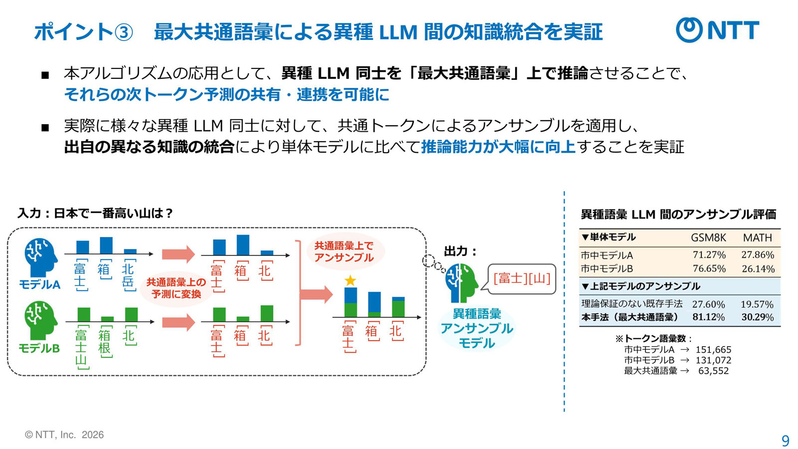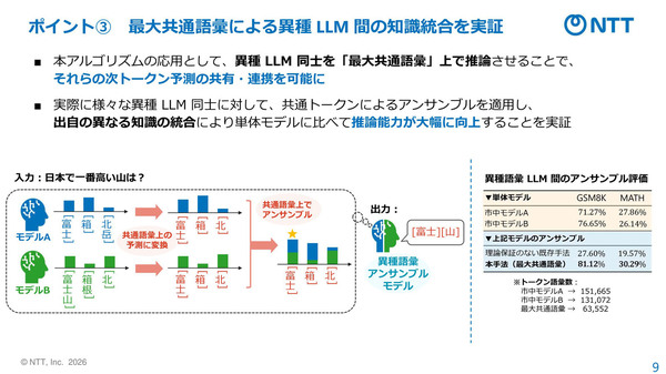 図1:異なる語彙を持つLLM同士でも、共通語彙を使って推論させることで、アンサンブルが可能になる(出典:NTT)拡大画像表示