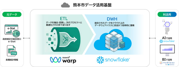 熊本市は2025年度、庁内のデータ分析基盤として米SnowflakeのDWH(データウェアハウス)を採用した。人口動態や社会経済統計などのオープンデータと行政データを組み合わせた分析環境を整備し、証拠に基づく政策立案(EBPM)の推進を図る。Snowflakeが2026年4月24日に発表した。