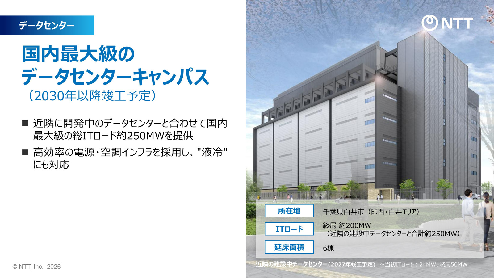 もう1つは千葉県白井市(印西・白井エリア)で、データセンターキャンパスを段階的に整備する(図4)。2030年以降に竣工を予定する6棟規模の施設は、最終的なIT電力容量が約200MWになる。近隣の建設中施設(2027年竣工予定、最終的なIT電力容量50MW)と合わせると、同エリア全体のIT電力容量は約250MWになる。