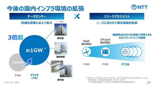 NTT、NTTデータグループ、NTTドコモビジネスの3社は、AI利活用の急速な拡大を背景に、国内データセンターのIT電力容量を拡大する。グループ全体で2033年度までに現在の約300MWから約1GWへと拡張する(図1)。また、複数拠点に分散したGPUリソースを顧客の需要に合わせて柔軟に割り当てるリソース管理機能も整備する。