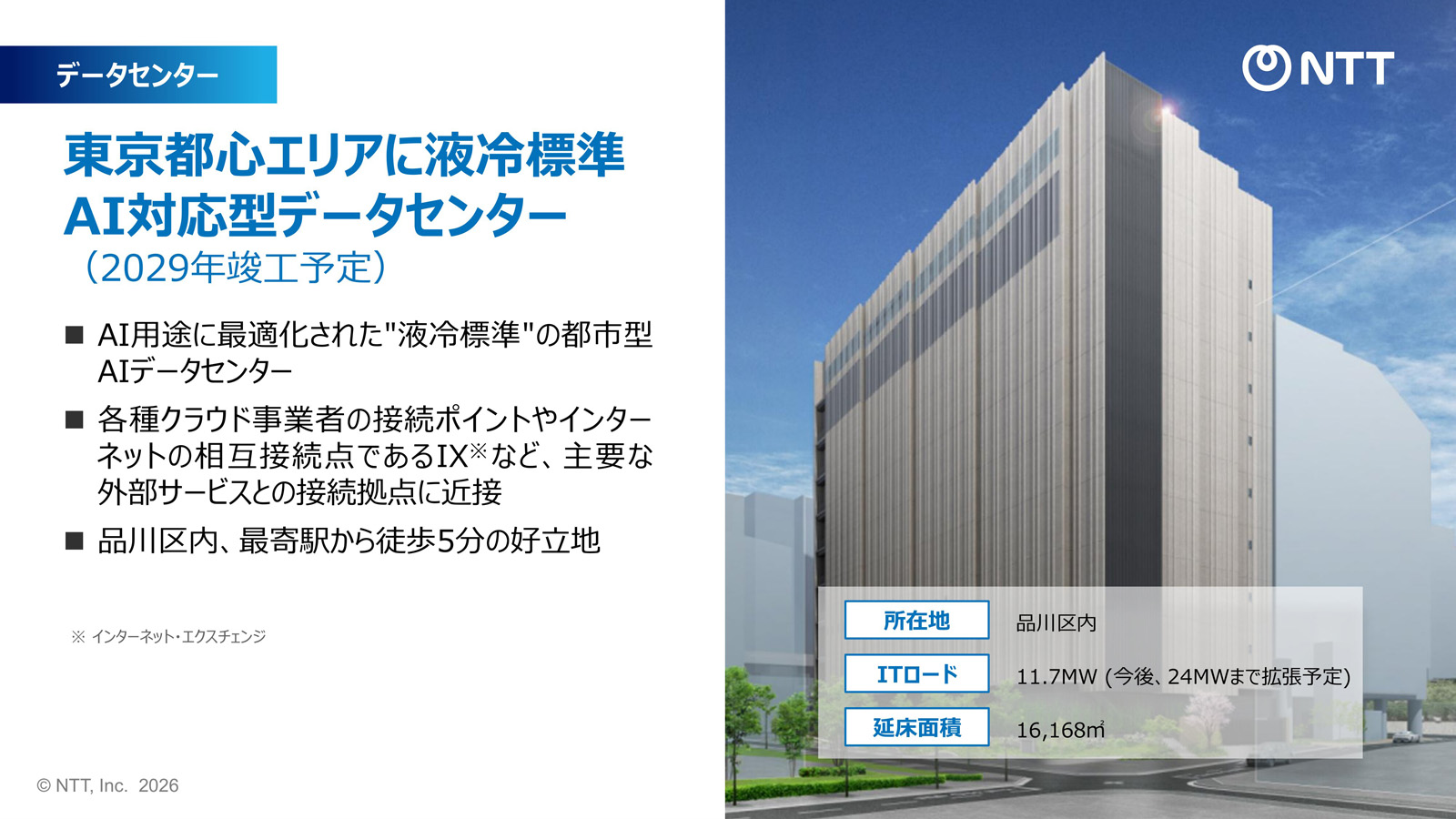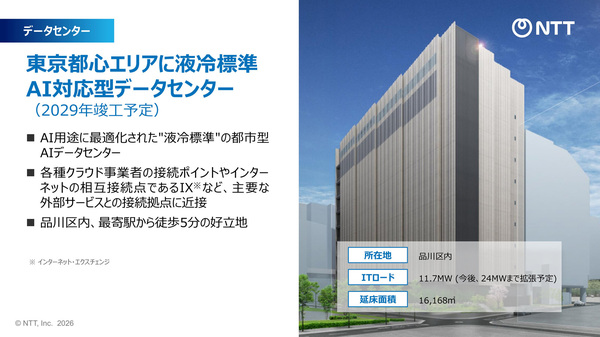 NTTドコモビジネスは、東京都心部に液冷を標準装備したAIデータセンターを新設し、2029年度の竣工を予定する(図2)。IT電力容量は11.7MWで、今後24MWまで拡張する。延床面積は1万6168平方メートル。AI用途ごとに分けた液冷フロアを標準で装備し、大規模演算に必要な高性能GPUを搭載した液冷サーバー機器を収容する。